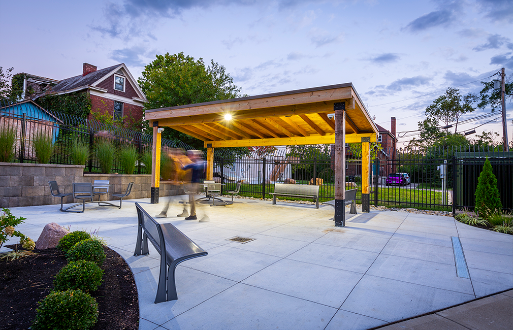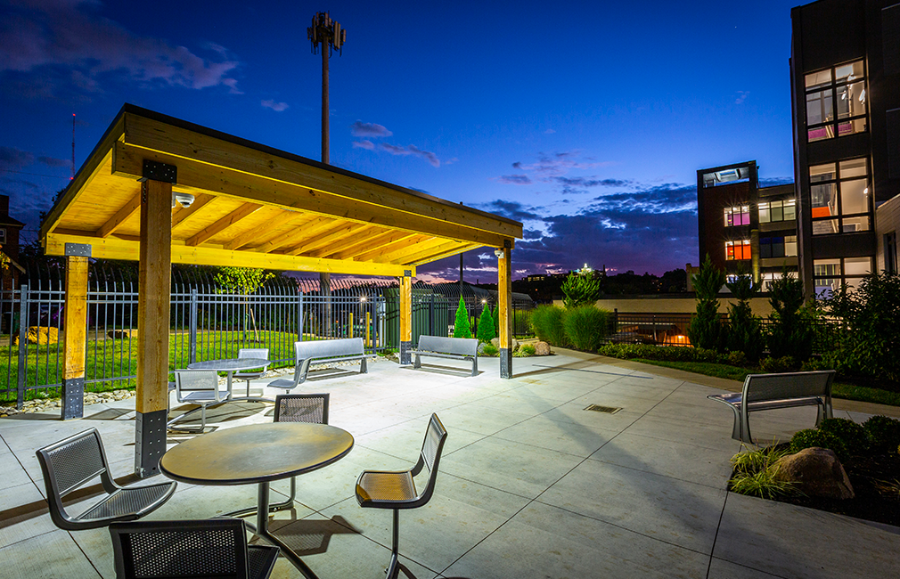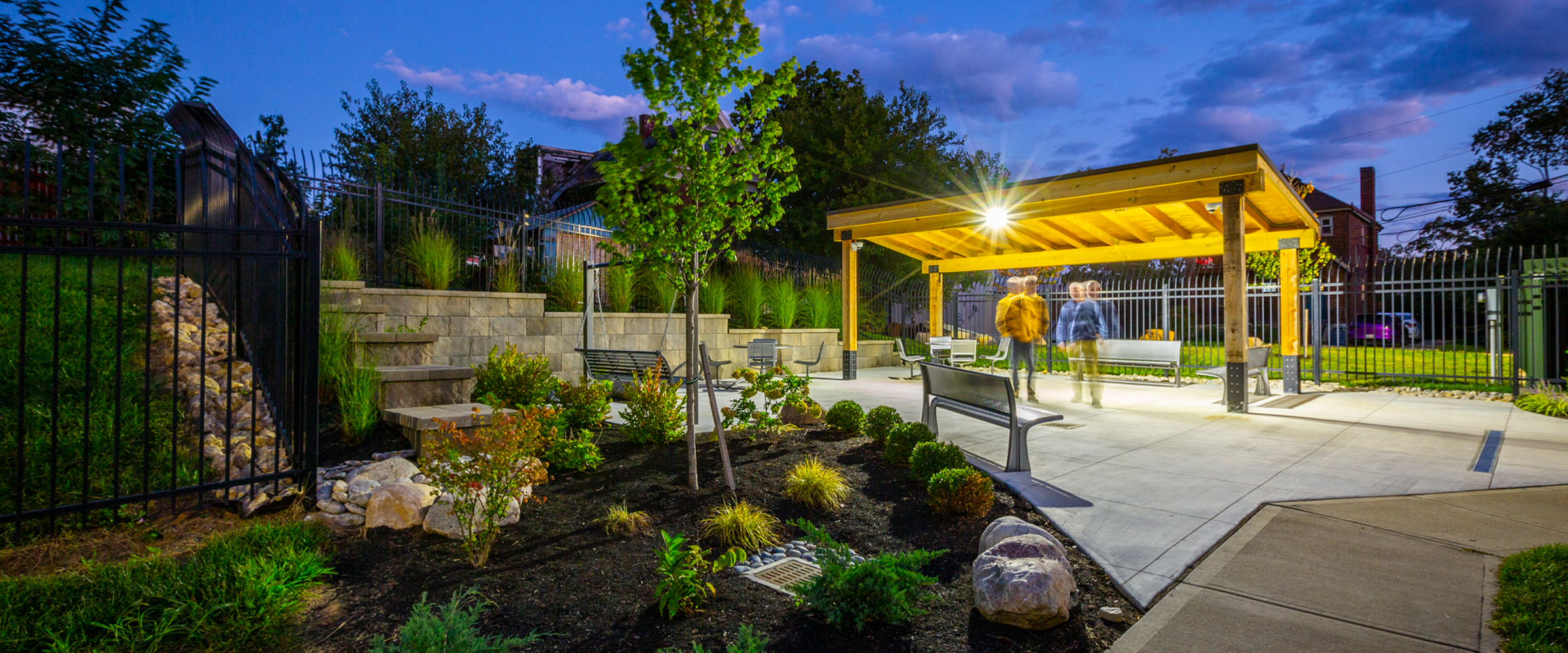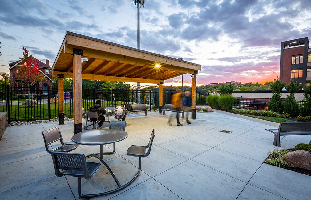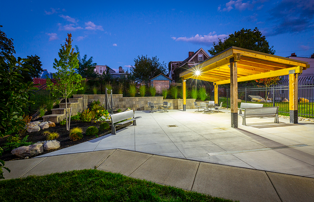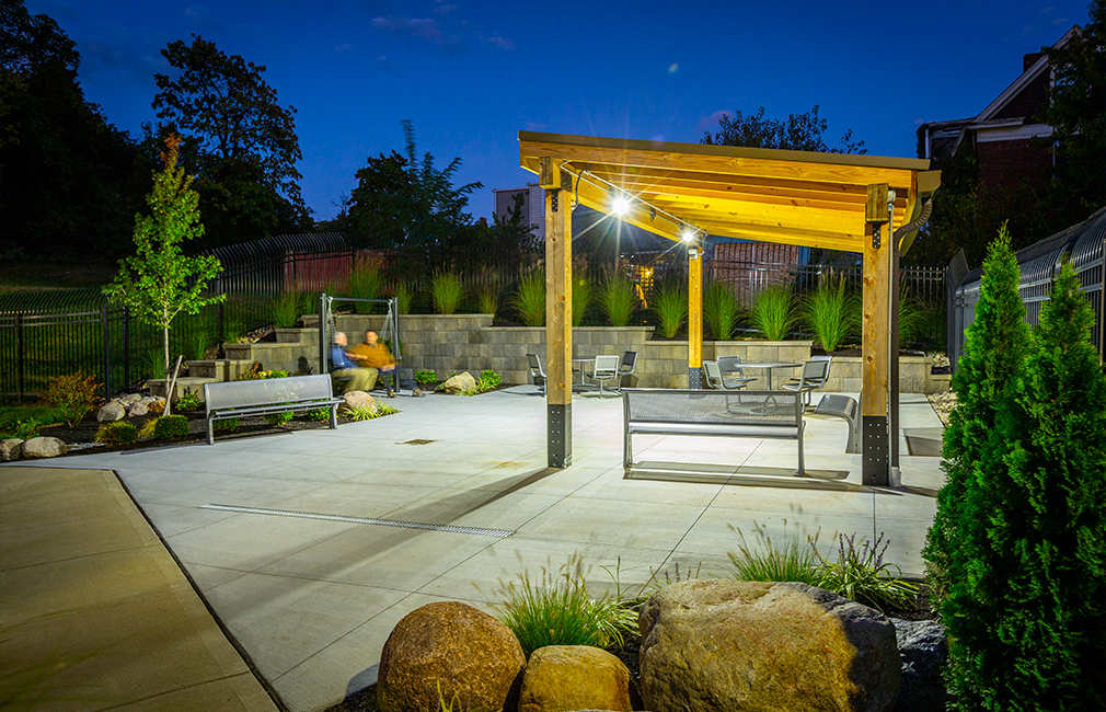 Sheakley Center Terrace is a new outdoor gathering space and terrace for the Lighthouse Sheakley Center for Youth in Cincinnati. The Center is a shelter where homeless young adults learn self-reliance and life skills.