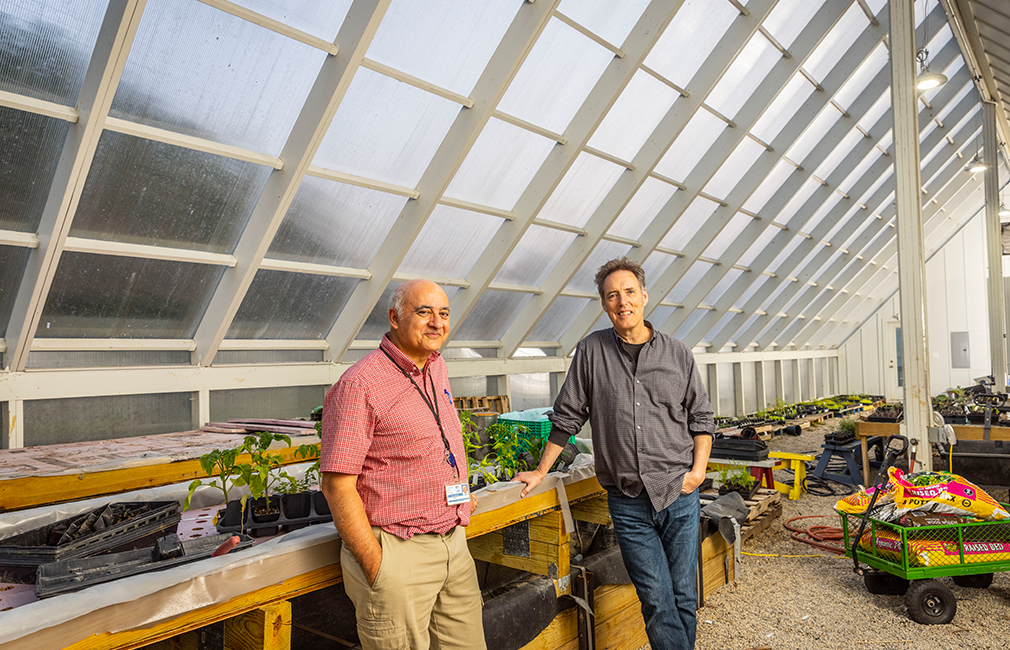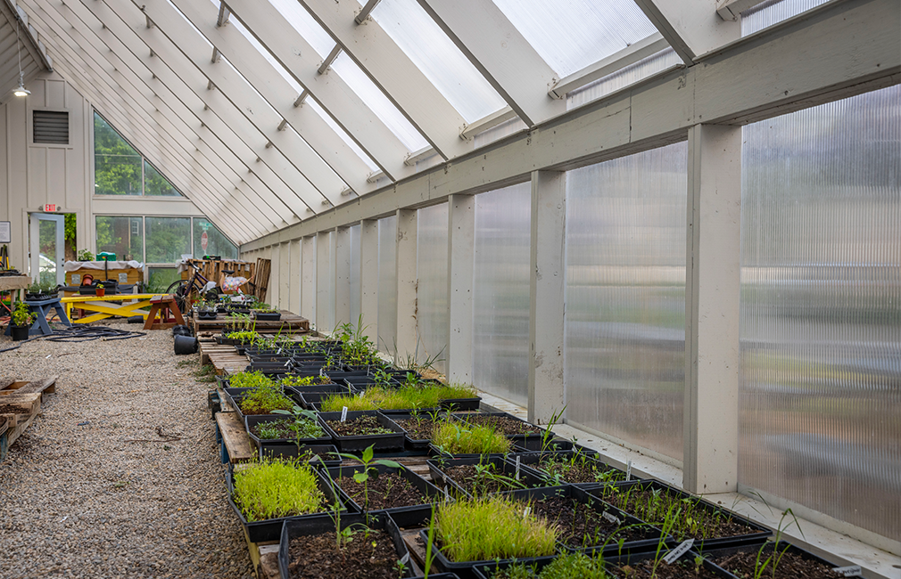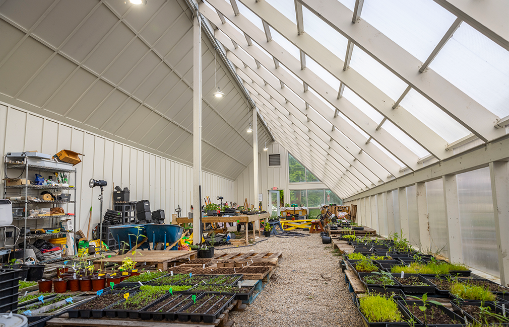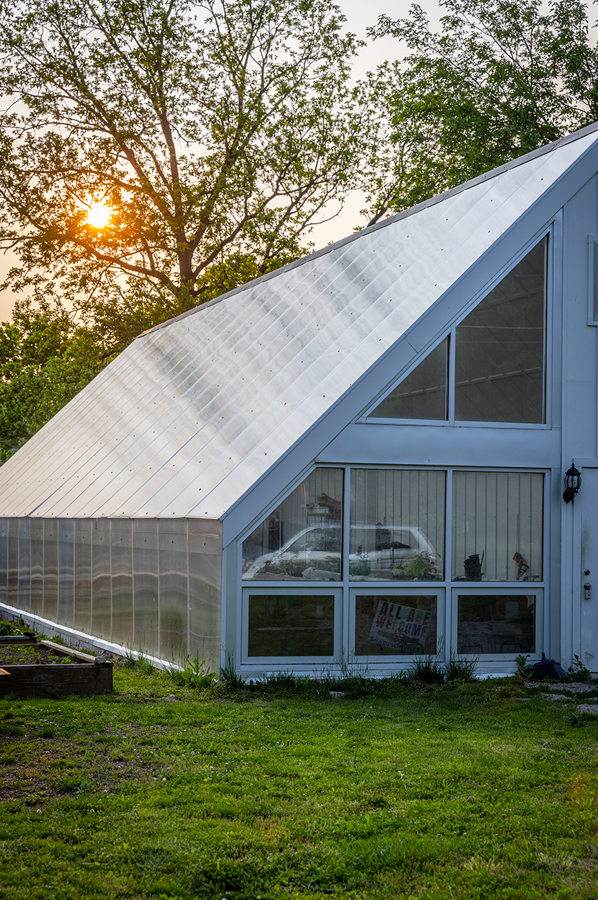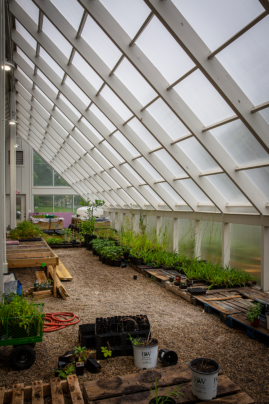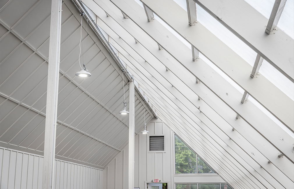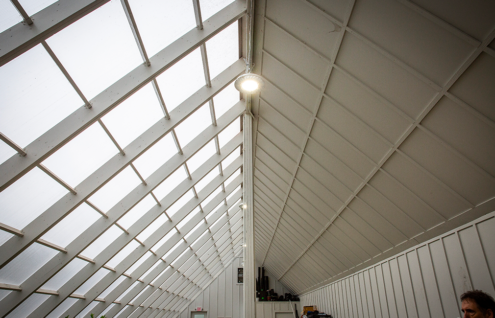 My design vision was to use an ordered grid based on the modular size of the polycarbonate solar glazing panels to create a white backdrop for the plant life inside and outside of the greenhouse.