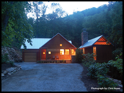 Mountain House This project features the use of building materials and forms typical of the region near Cashiers, North Carolina. Recipient: 2009 AIA C.O.R.A. Award Driveway Approach View from Creek View Toward Porch Living Room Staircase Detail Kitchen
